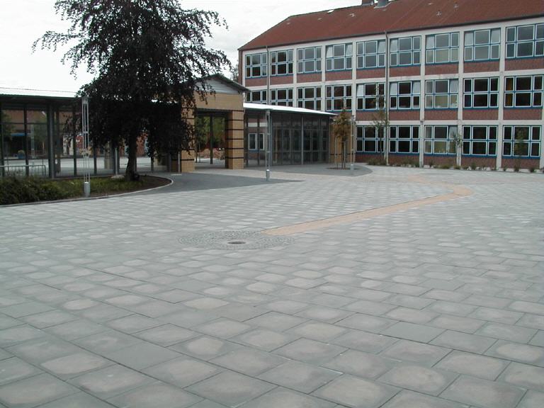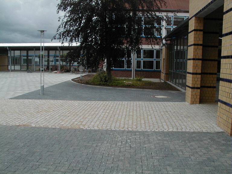 Erneuerung von 3 Verbindungsgängen zwischen den Gebäuden 1, 2, 3 und 7 einschl. Anbindung an die Sporthalle sowie Nutzungsmöglichkeit als Pausen- und Raucherhalle. Stahlkonstruktion, 3-seitig verglast, mit gemauerten Wandscheiben und Tordurchfahrt. Neugestaltung der angrenzenden Pausenhofflächen